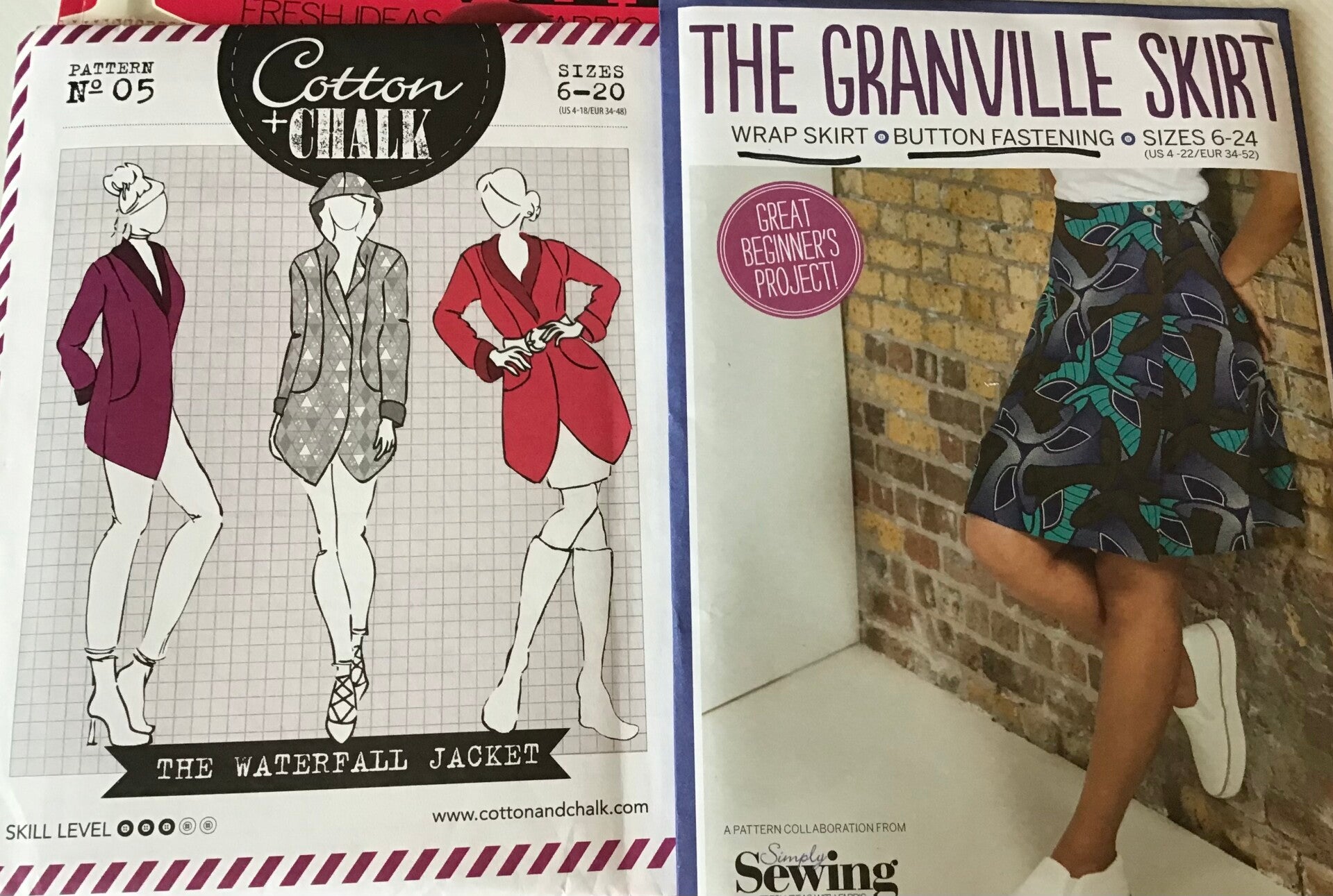 granville wrap skirt, waterfall jacket cotton & chalk, toy elephant, patchwork cushion, patchwork , dolls, embroidery, star signs, skirt pattern.